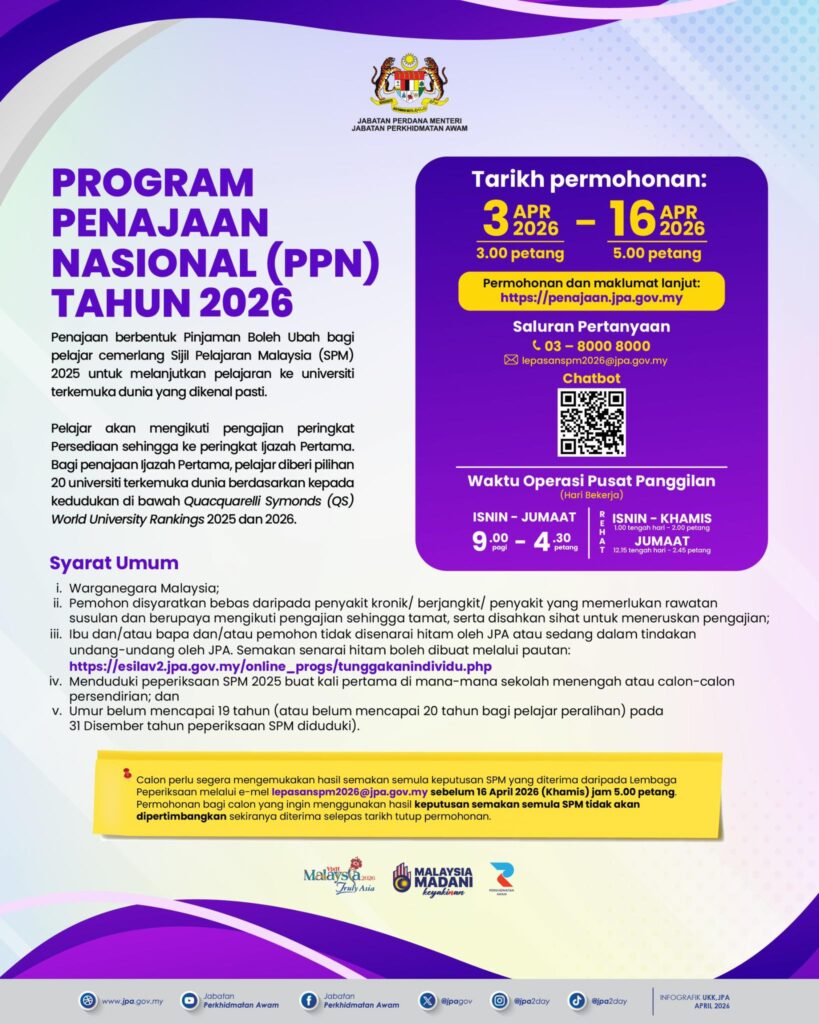 Permohonan bagi Program Penajaan Nasional (PPN) Tahun 2026 dibuka mulai 3 April 2026 (Jumaat) jam 3.00 petang hingga 16 April 2026 (Khamis) jam 5.00 petang.
